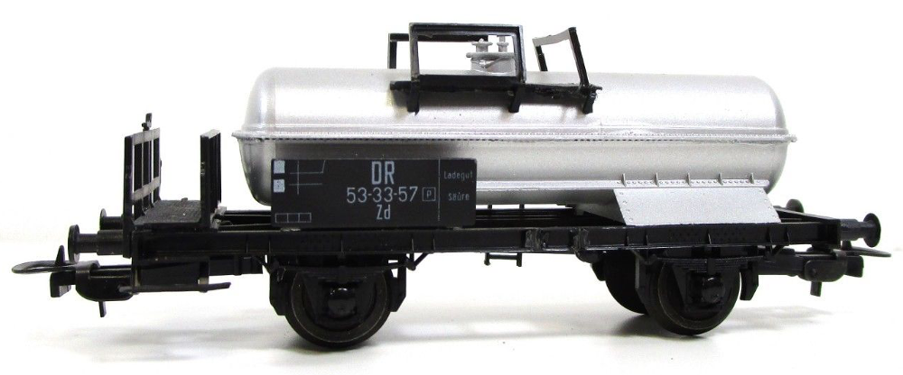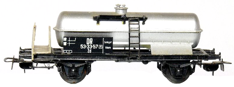 Tweeassige platte wagen met hierop een enkele kleine tank. De wagon heeft geen plankendek, de tank staat direct op het frame. Bijzonder is de mooie zilverkleur van de tank. De codering is voor DR (East Germany)