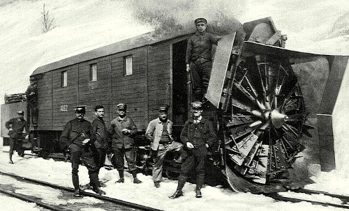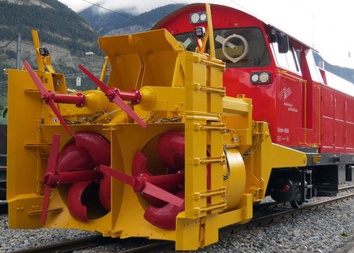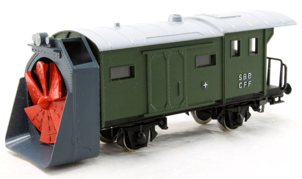 Wagon voor vrijmaken van de rails van sneeuw. In winterse omstandigheden komt een wagon voor de locomotief te staan. De grote ventilator voorop blaast de sneeuw weg. Dit soort wagons zijn in gebruik sinds de oorlog.