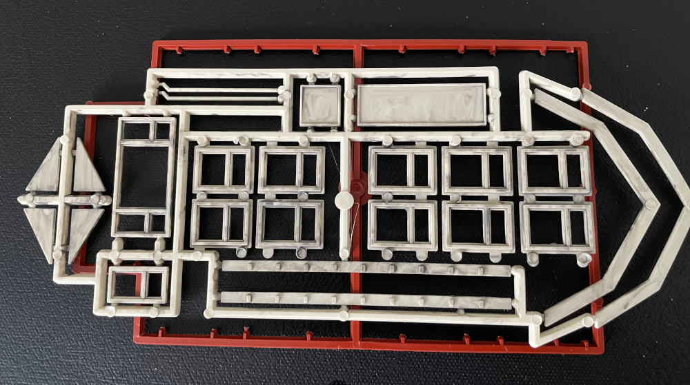Op bovenstaande foto zie je het witte raamwerk. De raampjes, sierlijsten etc zitten er nog allemaal in vast. Er zit al wel een dunne grijze waas van de grondverf op. Onder het witte raamwerk zie je een bruin raamwerk. Dat is het raam waarin eerst de muren en het dak hebben gezeten. Deze heb ik eruit gehaald. Ik gebruik het resterende bruine raamwerk hier om het witte raamwerk omhoog te houden. Dat voorkomt druppels en aanhechtingen aan de onderkant.