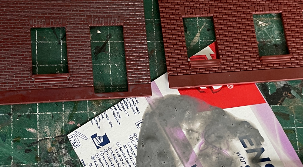 Het enige probleem met acrylverf is dat het in de basis niet lekker hecht op het soort plastic waarvan huisjes en treinen zijn gemaakt. Hiervoor zijn gelukkig twee oplossingen. Primer en spuug.