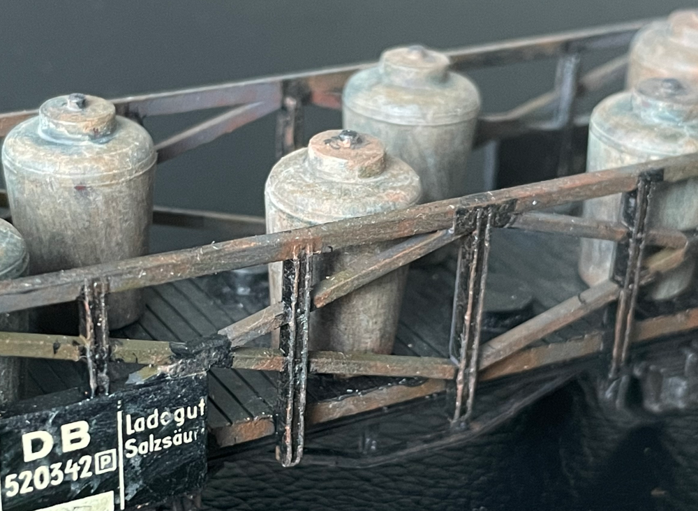 In de foto hierboven, is iedere plank van deze wagon los bewerkt, gekleurd en aangezet. Daar over heen zijn olie sporen en spatten toegevoegd. Ook slijtageplekken en vervuiling zijn erop geverfd. De weathering is hier over de kleuren van de planken gezet. Door een bonte mix van kleuren is niet meer te zien dat we hier naar een gewoon plastic vloertje kijken.