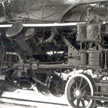 De 2 cilinder liggen in V vorm, haaks op de rijrichting. Onder de locomotief zijn de zuigerstangen verbonden met de centrale as. De aandrijfas loopt door tot in ieder aangesloten draaistel. Binnen het draaistel zijn de wielen aangesloten met een koppelstang.