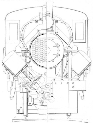 Op de linkerkant van de tekening, is het toegangsluik niet opgenomen, je kijkt hier recht op de vlampijpen in de stoomketel. Links eronder zie je weer de stoomcilinder met midden onder in beeld de centrale aandrijfsaf. Vanaf de cilinder lopen de ijzeren stangen voor de aandrijving naar de as.