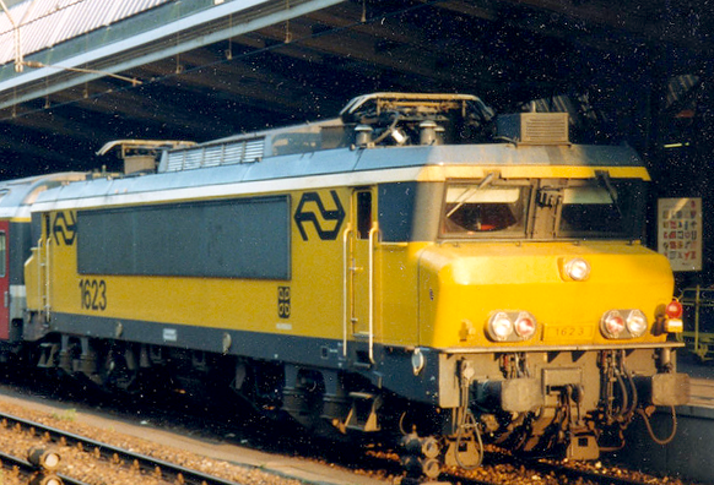 De 1623 heeft dus zowel een electrische als een diesel motor. Op de foto hierboven (een keer ergens gescand geen idee meer) zie je de 1623 staan met de beide stroomafnemers (de pantograven) naar beneden. Als de 1623 electrisch rijdt, dan staat er een van de pantograven uitgeklapt tegen de bovenleiding.