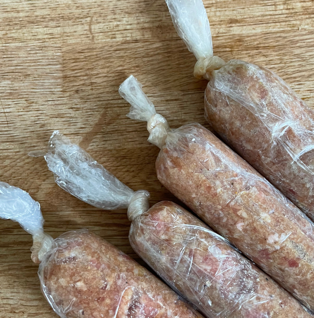 Een andere methode is om het gehakt in dunne rollen uit te rollen. En deze strak in te pakken in plasticfolie.