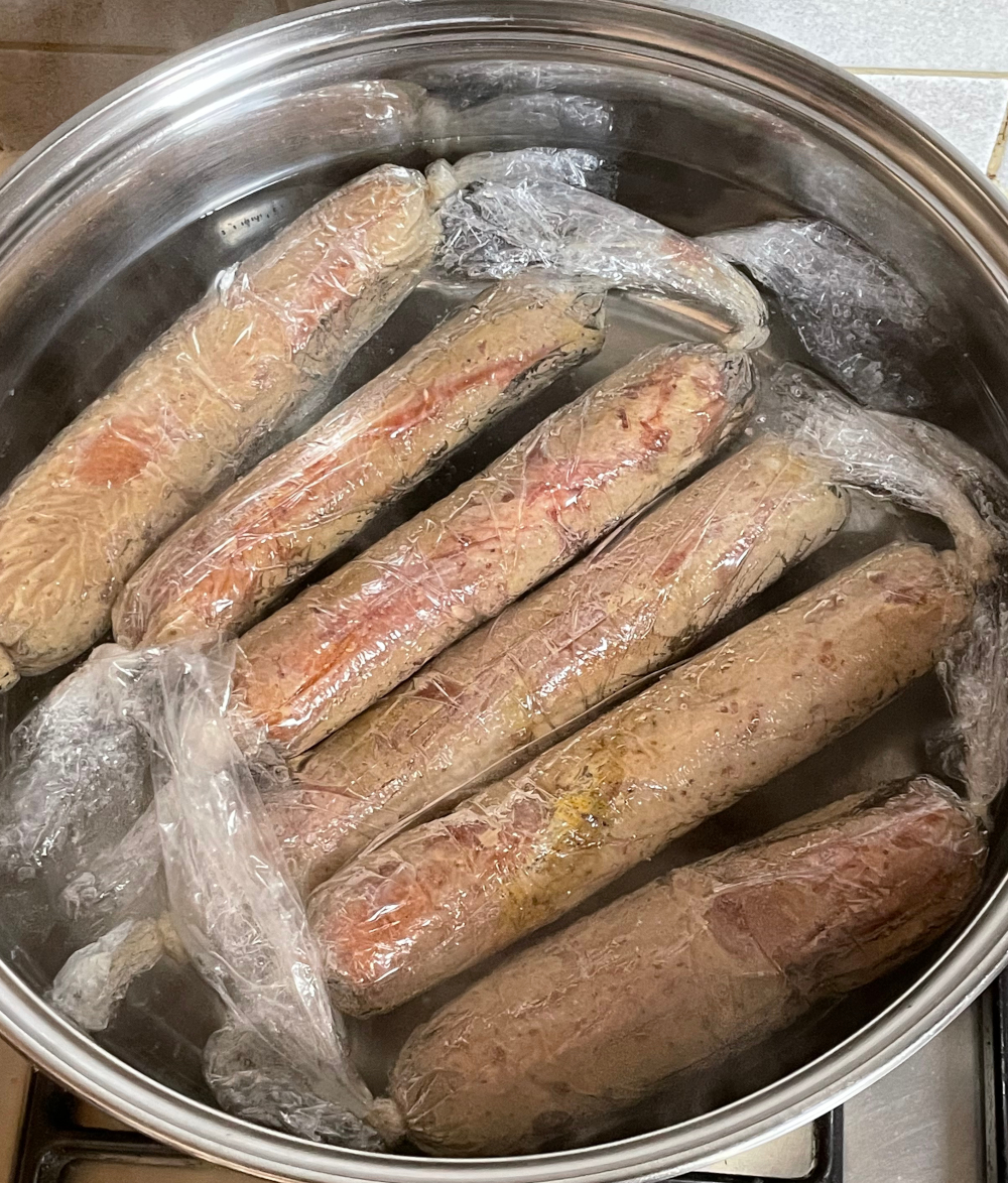 Het lastige aan dit recept is om pijpjes te komen om de frikandellen in te koken. Je hebt pijpjes nodig van een 25 centimeter lang en een doorsnede van ongeveer 3 centimeter. Deze pijpjes moeten goed tegen warmte kunnen omdat ze behoorlijk lang in kokend water komen te liggen.