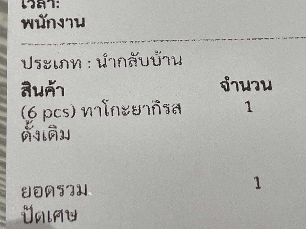 Op vakantie in Thailand hebben we inktvis balletjes op. Razend lekker. Warme ballen (denk aan fijne gehaktballen) uit de frituurpan met een mooie saus erover. Bijgaande kassabon is alles wat ervan rest. En de herinnering natuurlijk. En de foto's. De kassa bon hadden we nog. Daaruit valt te lezen wat de naam is