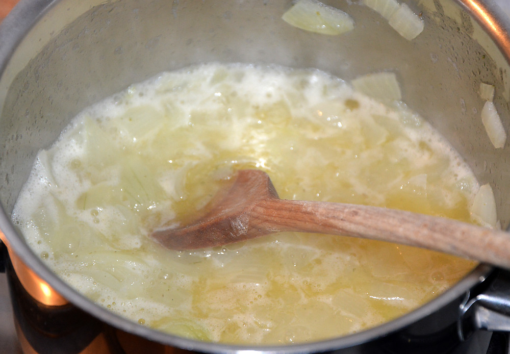 - Als de boter gesmolten is de uien toevoegen en op een heel laag vuur laten staan tot de uien zacht zijn geworden.