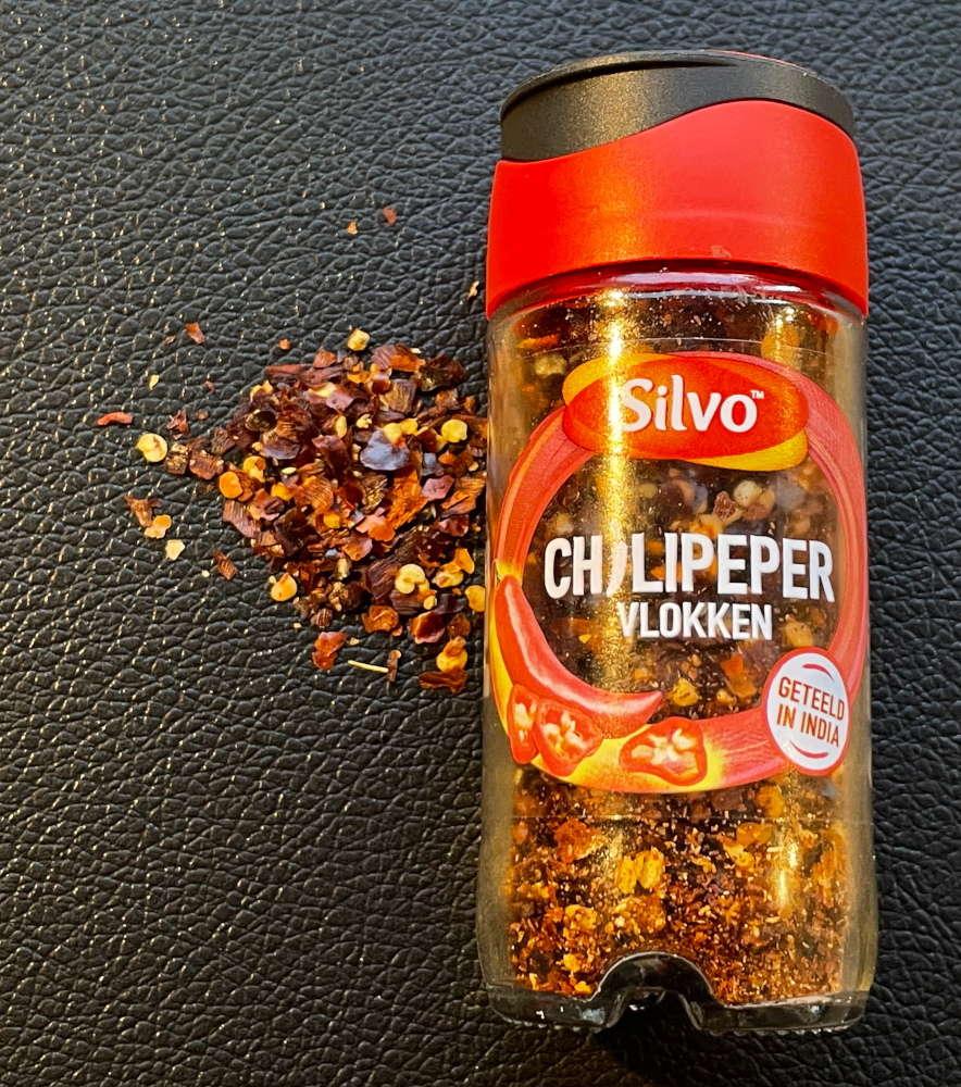 Het woord Chilipepervlokken moet aan elkaar worden geschreven. Het eerste woord beschrijft het tweede woord, dus moet het aan elkaar.