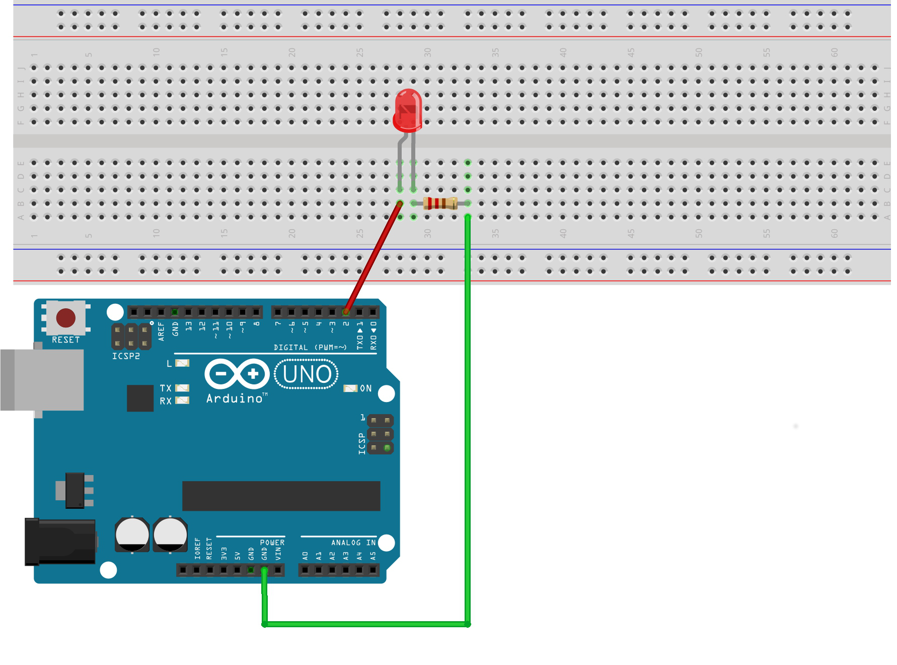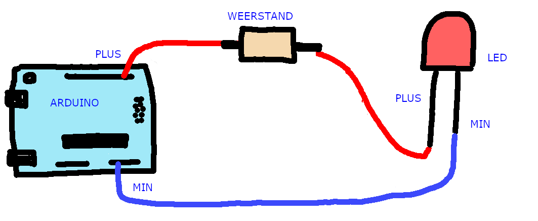 In ons geval zal de Arduino nu voor de stroom zorgen. Het lampje is vervangen door een LED. Doordat we een LED gebruiken moeten we ook een weerstand toevoegen (omdat we anders de LED opblazen). Maar het principe van de stroomkring is het hetzelfde.