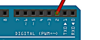 Hierboven zijn we ingezoomed op de aansluitingpunten van de Arduino. In Arduino termen heten dit pins. Op iedere pint kan een kabel worden aangesloten. Op deze Arduino is de rode kabel verbonden met pin nummer twee (2). In onze code hebben we acties gedaan naar pin 2.