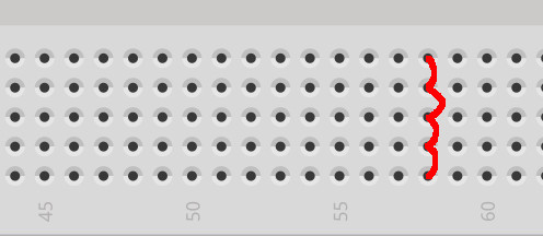 Hier zien we een klein stukje van het breadboard. Daar lijkt op het eerste gezicht niets bijzonders mee aan de hand. Dat is echter wel. Alle aansluitingen (pins) op het breadbord die zo bij elkaar zitten zijn (in het board) met elkaar verbonden. Dus alle pins in kolom 57 zijn gekoppeld aan elkaar. Als we stroom zetten op de bovenste pin, dan zal dat in alle pins eronder kunnen worden gebruikt. Op deze Arduino is de rode kabel verbonden met pin nummer twee (2). In onze code hebben we acties gedaan naar pin 2.