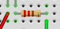 - Onder de LED zie je een bruin ding met streepjes erop. Dat is een weerstand.