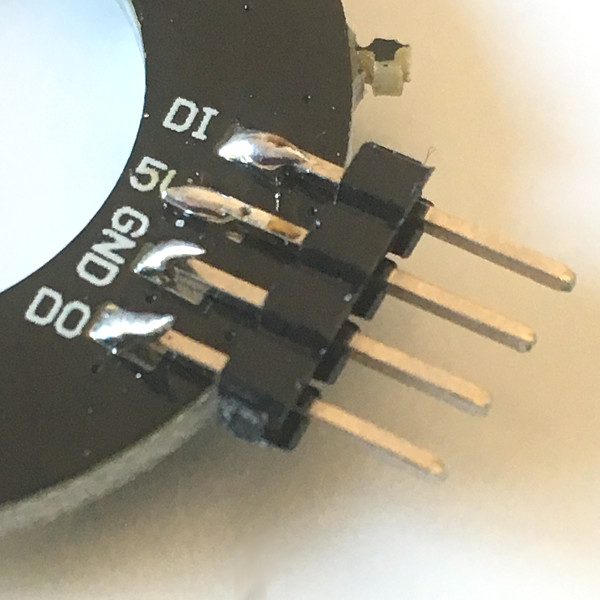 Wat ik aanraad is, om 4 pinnetjes van een multipin connector te knippen en deze op de LED ring vast te solderen. Als je de ring rechtop wilt hebben, dan kun je een gewone rechte multipinconnector gebruiken, anders is degene met een hoek erin wellicht praktischer. De pinnen van de multipinconnector zitten al precies op de goede afstand, dus je kunt deze er gewoon opleggen, en op iedere contactplaat een druppeltje soldeertin laten vallen.