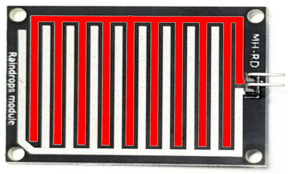 Als er regendruppels op de sensor vallen dan zal er een kortsluiting ontstaan tussen de stroom in de ene hand en de andere hand. De sensor werkt hiermee als een soort variabele weerstand. Vergelijk dit eens met de potentiometer, die in wezen op dezelfde manier werkt.