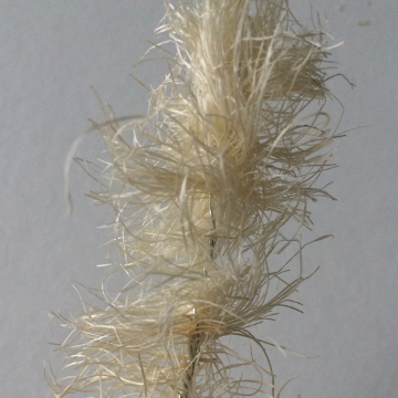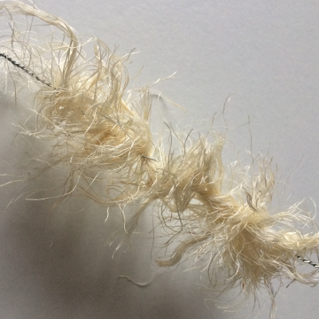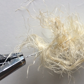 Door de draaiing in het sisal blijven deze stukjes lekker aan elkaar zitten. Dat is niet wat we willen. Pluis de touwtjes uit zodat er enkel losse strengetjes sisal overblijven.