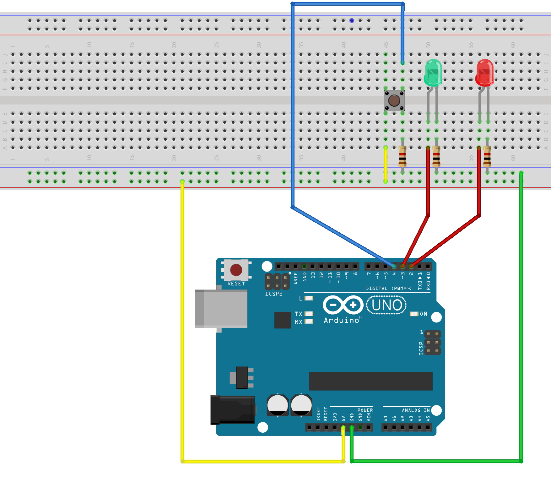 Dit is soort controle programma. De rode LED zal continue branden. Als je op de knop drukt zal de groene LED aangaan. Als je de knop weer los laat, dan zal de rode LED weer aangaan.