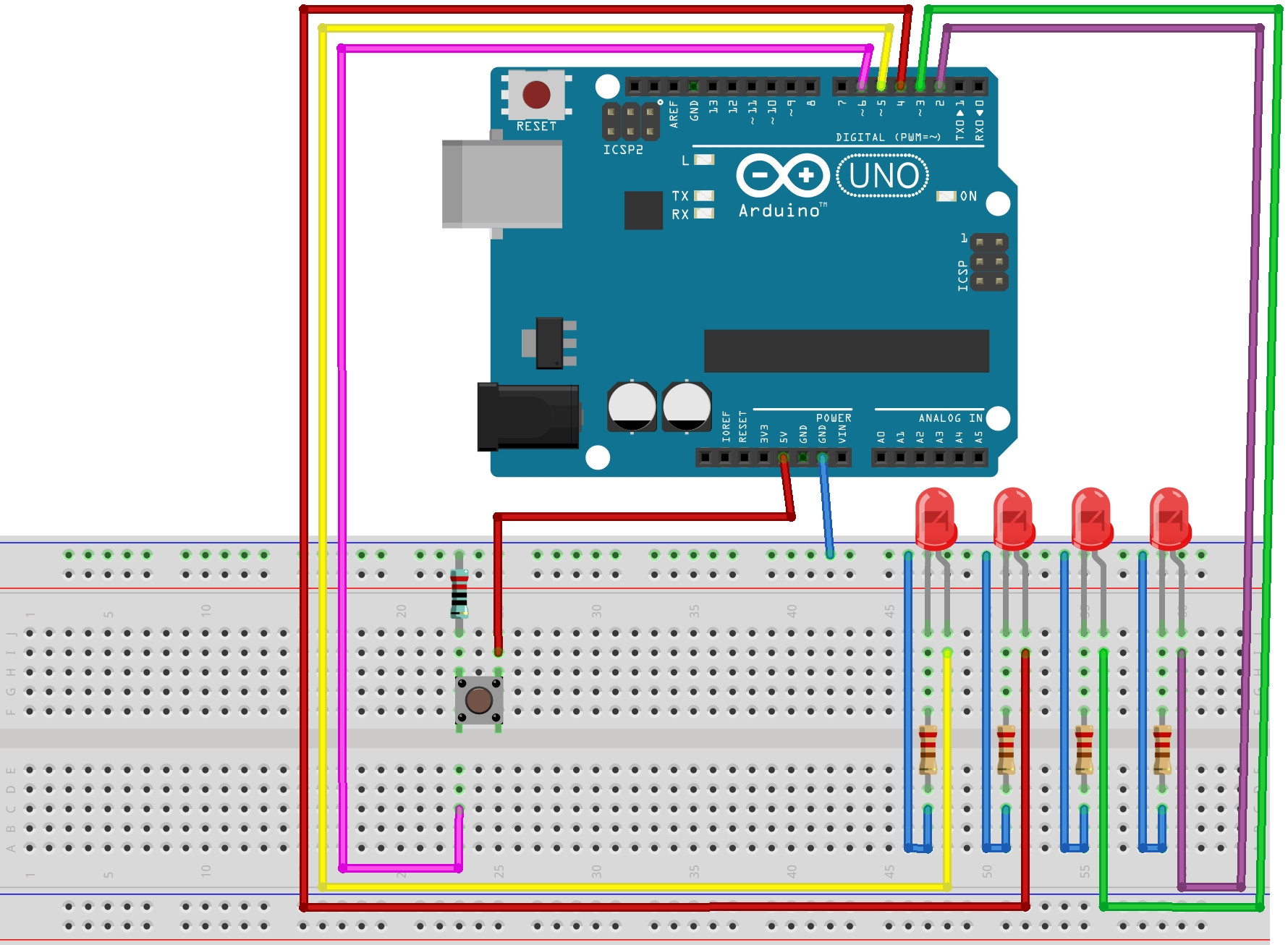 Iedere keer als we op de knop drukken dan zal het volgende LEDje aangaan.