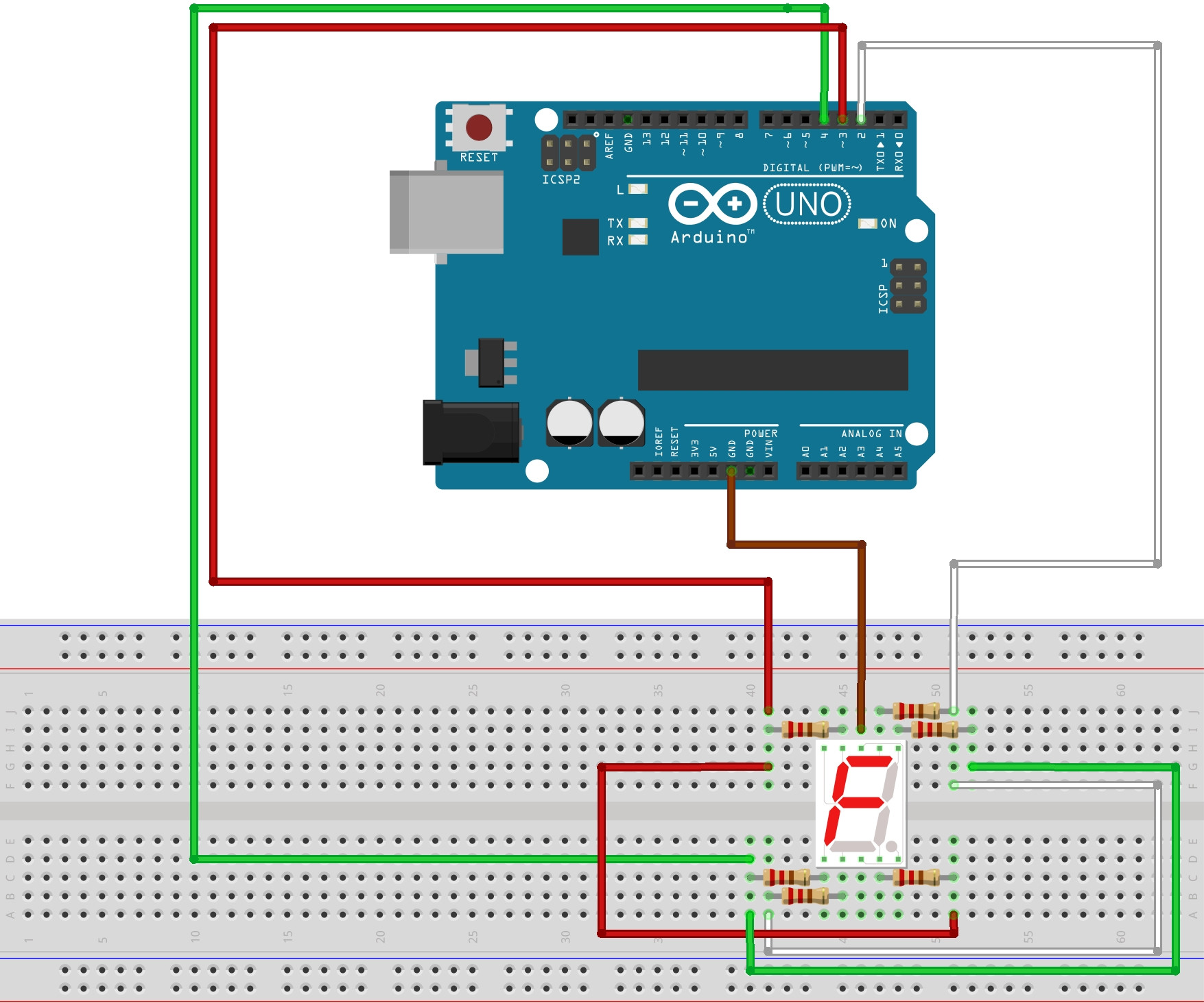 We hoeven maar 3 aansluitingen te hebben omdat we 3 stadiums hebben. Per stadium laten we 2 LEDs branden, de verbinding ervan schakelen we op het breadbord door. Bekijk bijvoorbeeld de witte draad. Deze komt op de Arduino uit pin 2. Loopt dan naar het breadboard waar op een rij zowel een weerstand is ingestoken (die loopt verder naar de een-na-rechtse pin rechtsboven op de 7Led), de andere pin maakt verbinding met een rij op het breadboard (welke dan verbinding maakt met een weerstand en de een-na-linkse pin onderop de 7Led.)