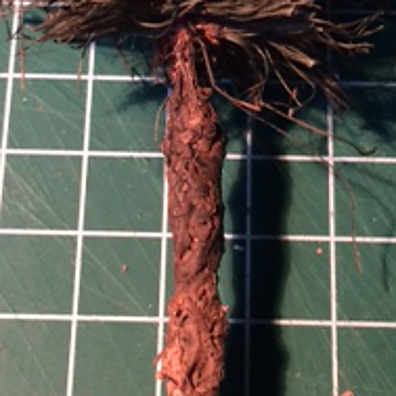 Met een natte kwast brengen we veegjes en stipjes aan op de bast en takken. Door het gebruik van een natte kwast zal de verf is