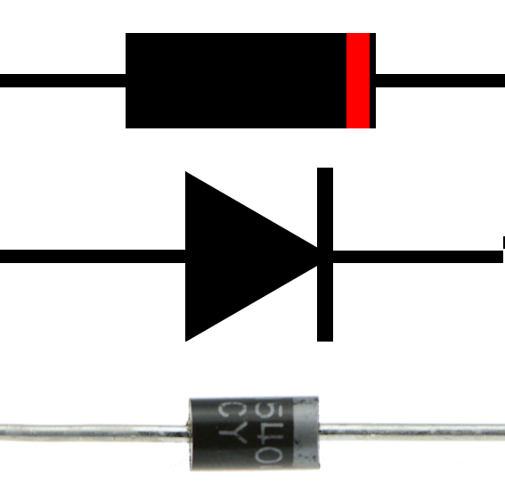 - De bovenste afbeelding geeft een schematische schets aan hoe een diode er uit kan zien. Aan de ene kant de rode (of andere kleur) streep die wil zeggen dat als de stroom aan die kant binnenkomt die zal worden tegengehouden. Als de stroom van links komt dan zal die gewoon doorlopen.