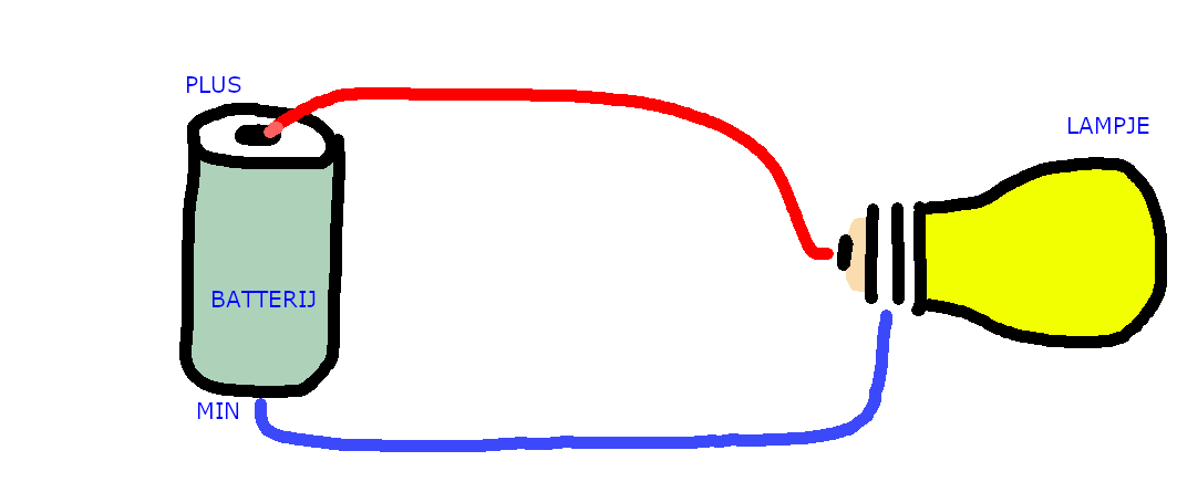 Je ziet de stroom kan een rondje lopen. Van de PLUS van de batterij (de kant met het uitstekende staafje). Door de draad naar de lamp. Door de lamp (die licht zal geven). Vanuit de lamp naar de MIN (onderkasnt) van de batterij. Er is een kring, een stroomkring, en de lamp zal gaan branden.