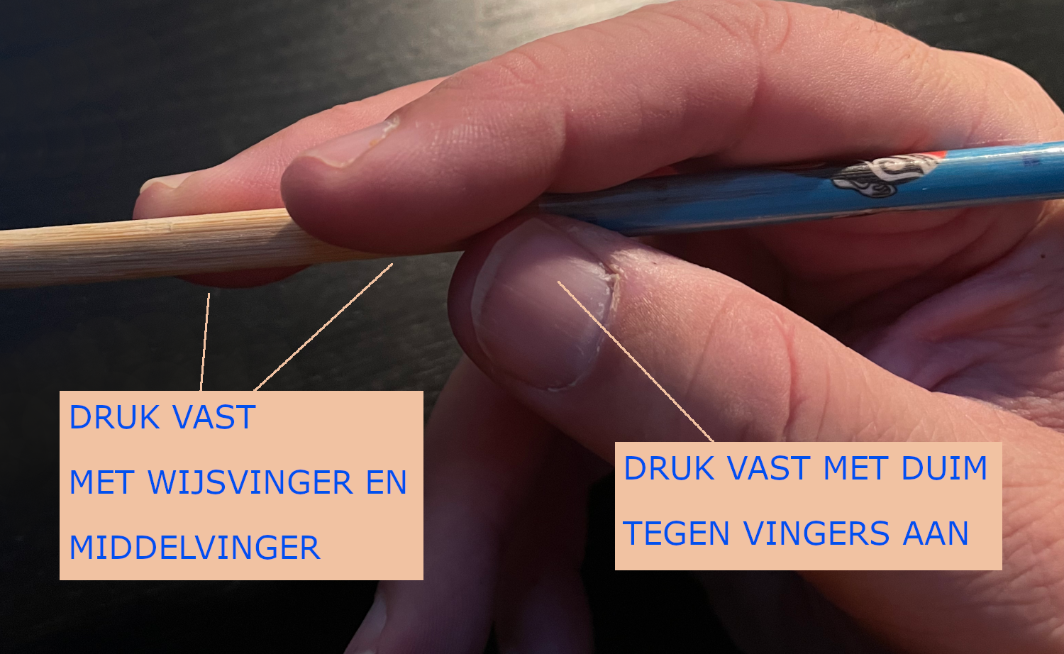Het vaste-stokje leg je in de ruimte tussen je wijsvinger en duim, dat is een soort holte. Dat is onderaan het stokje Druk het stokje er zo diep mogelijk in. Halvewege het stokje geef je tegendruk met je ringvinger. Je drukt nu dus op 3 plaatsen tegen het stokje. Met de ringvinger naar je toe. Met de holte van je duim van je af en in de ruimte tussen druk je met de duim het stokje tegen je ringvinger en in de holte tussen wijsvinger en duim zet je het vast.