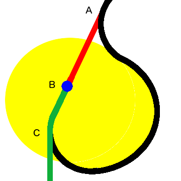 Is dat leuk? Ja dat is hartstikke leuk. Hieronder staan de sporen rondom Antwerpen schematisch aangegeven. Treinen komende uit het Noorden splitsen bij punt A. De HSL gaat via het rode spoor verder naar station Antwerpen (de blauwe stip bij B). De gewone sporen gaan via de zwarte lijnen om Antwerpen (geel vlak) heen en komen dan uit het zuiden aan bij punt C om vanuit hier Noordwaards te gaan over het groene spoor naar het station Antwerpen (punt B).
