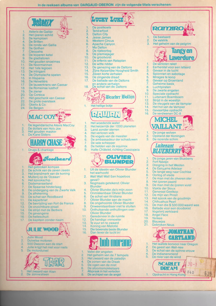Een pagina, geel van kleur, met hierop bekende series met afbeelding van de hoofdpersoon. Eronder een lijst albums uit de betreffende serie. 3 kolommen